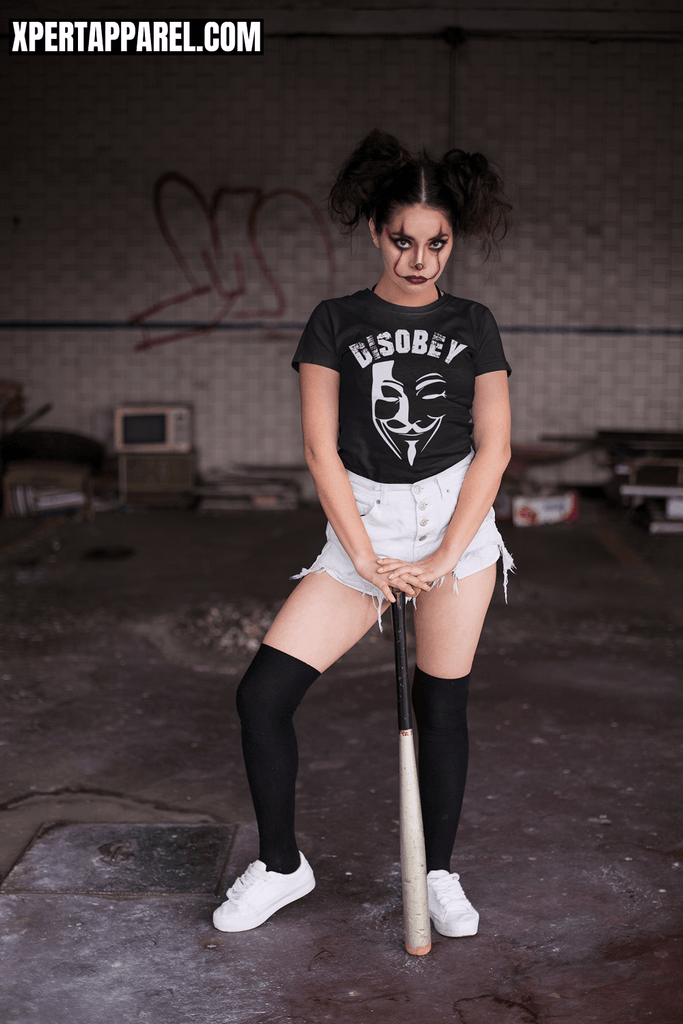 Woman with painted face and Baseball Bat wearing Black T-shirt with Vendetta Mask Disobey design from the Xpert Apparel Store