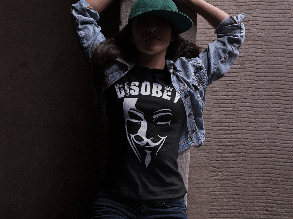 Girl in Jeans Jacket and Black T-shirt with Vendetta Mask Disobey Design  from the Xpert Apparel Store
